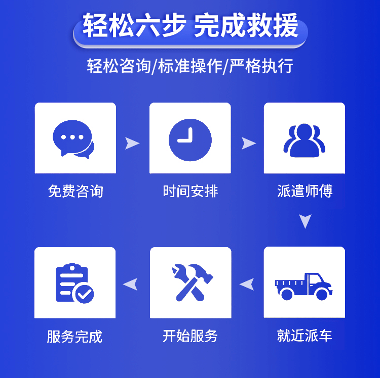 3. 救援团队携带设备赶往现场,一般到达时间为30分钟以内(视具体路况)。